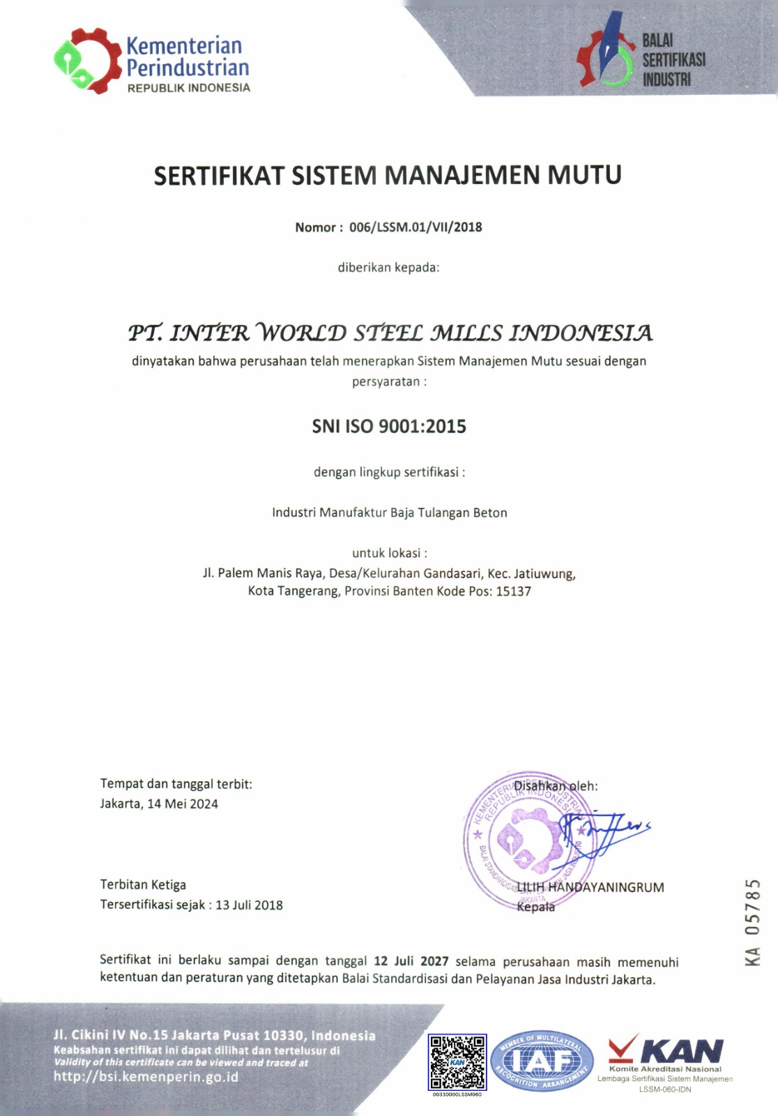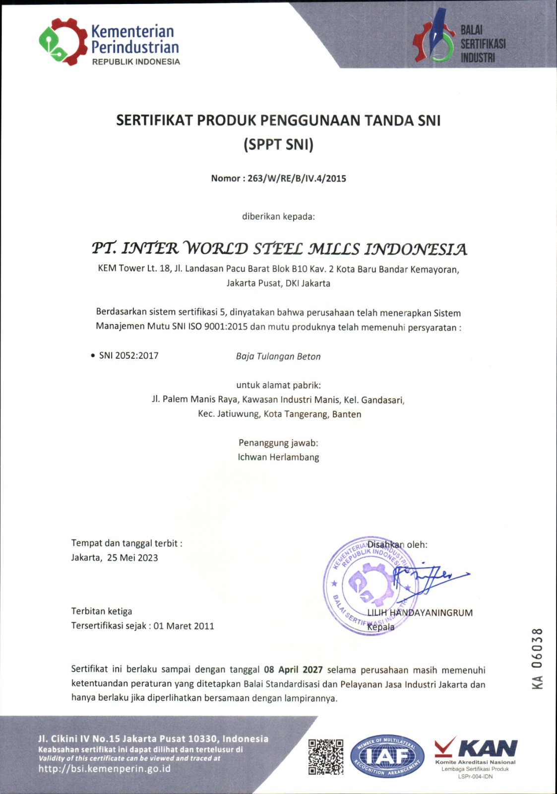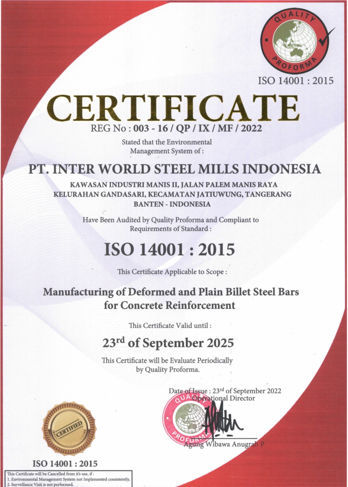 Inter World Steel Mills Indonesia salah satu pabrik baja di Indonesia dan penyedia rangkaian besi dan baja dengan berkualitas tinggi. Kami sudah bersertifikasi SNI ISO 9001. Komitmen terhadap prinsip-prinsip model operasi yang seimbang, kami terus meningkatkan kualitas efisiensi dan proses bisnis. Kami terus memajukan bangsa ini dengan memproduksi dan menjaga kualitas SNI besi beton terhadap calon pengguna produk kami dan seluruh masyarakat. |